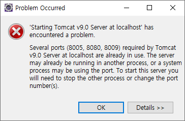 Tomcat 실행 오류 - Several ports (8005, 8080, 8009) required by Tomcat v9.0 Server at localhost are already in use.